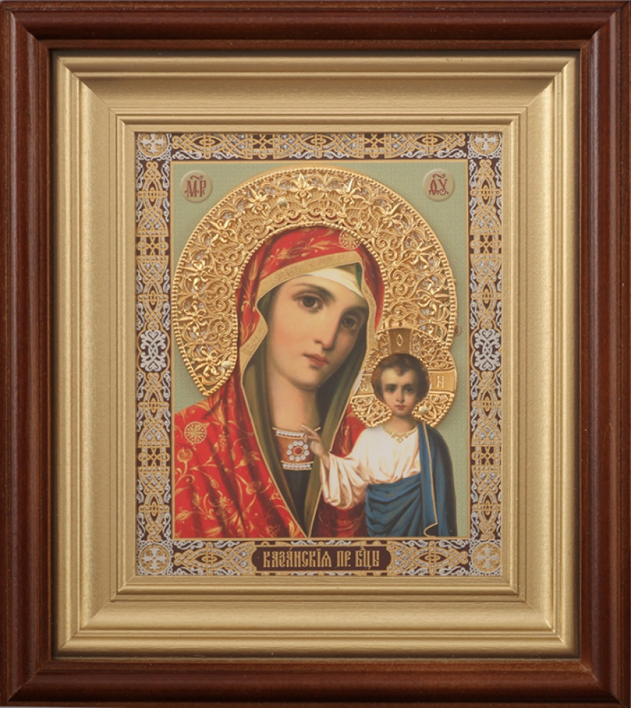 Икона в киоте 11х13 сложный, двойное тиснение, золочёный венчик Казанская БМ 31