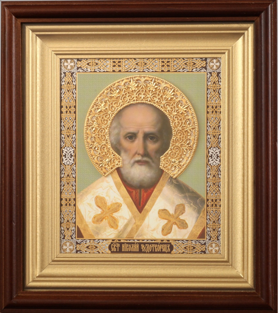 Икона в киоте 11х13 сложный, двойное тиснение, золочёный венчик Николай Чудотворец 31