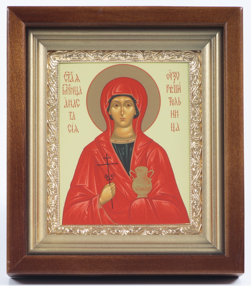 Икона в киоте 11х13 сложный, темпера, рамка золочёная Анастасия Узорешительница