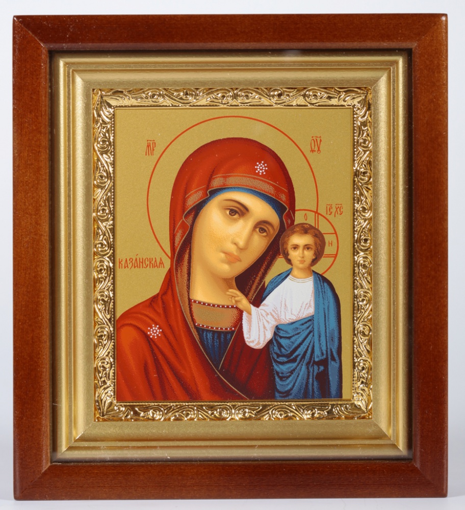 Икона в киоте 11х13 сложный, темпера, рамка золочёная Казанская БМ 1