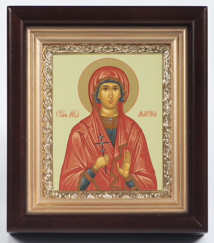 Икона в киоте 11х13 сложный, темпера, рамка золочёная Марина