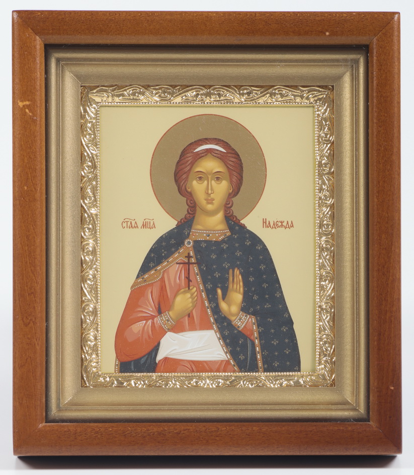 Икона в киоте 11х13 сложный, темпера, рамка золочёная Надежда
