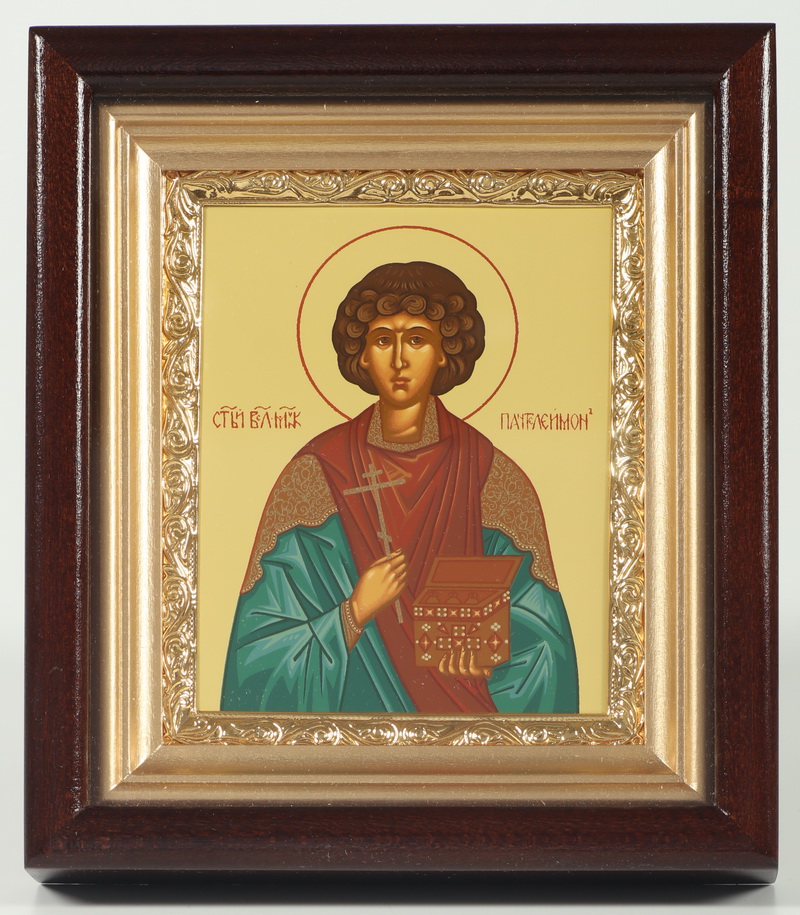 Икона в киоте 11х13 сложный, темпера, рамка золочёная Пантелеимон