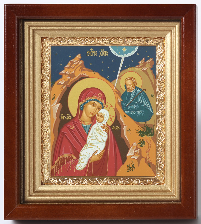 Икона в киоте 11х13 сложный, темпера, рамка золочёная Рождество Христово 2