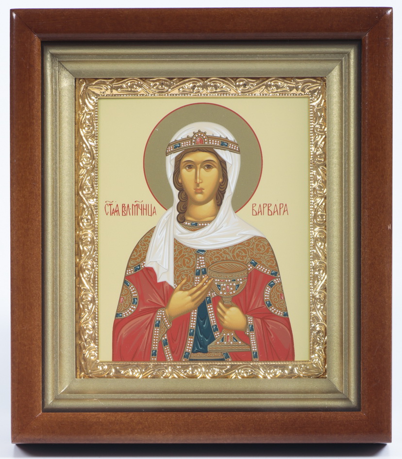 Икона в киоте 11х13 сложный, темпера, рамка золочёная Варвара