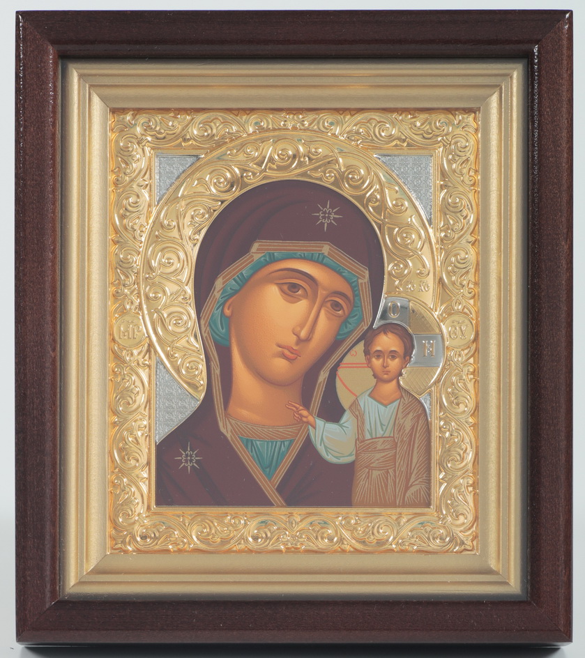 Икона в киоте 12х14 сложный №2 темпера, никель, золочение Казанская БМ