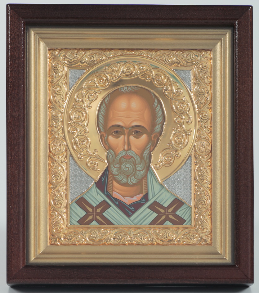 Икона в киоте 12х14 сложный №2 темпера, никель, золочение Николай Чудотворец
