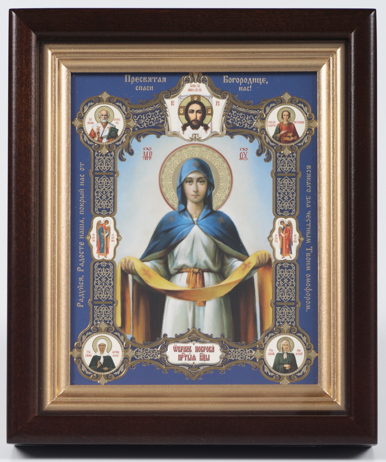 Икона в киоте 13х18 сложный, конгрев, плёнка Покров (с клеймами)