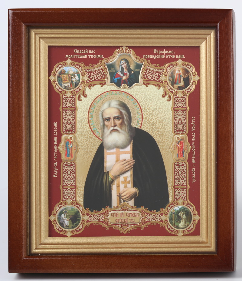 Икона в киоте 13х18 сложный, конгрев, плёнка Серафим Саровский с клеймами