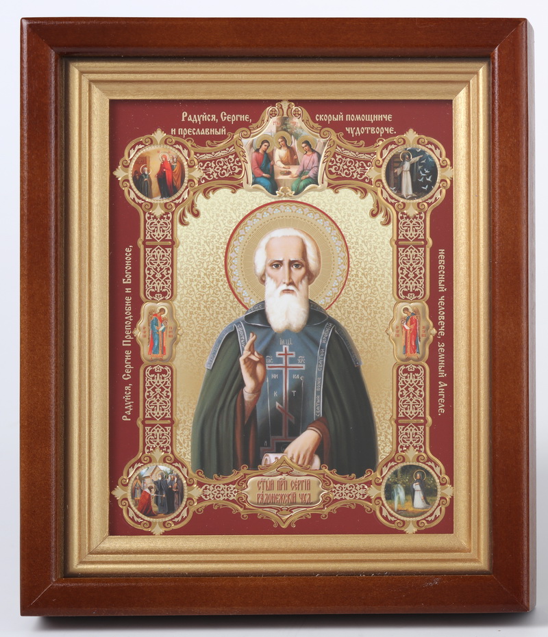 Икона в киоте 13х18 сложный, конгрев, плёнка Сергий Радонежский с клеймами