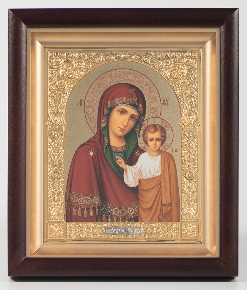 Икона в киоте 15х19 сложный, темпера №8, рамка фигурная, золочёная Казанская БМ 1