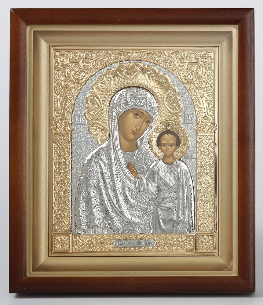 Икона в киоте 15х19 сложный, темпера, риза объёмная, никель, золочение Казанская БМ