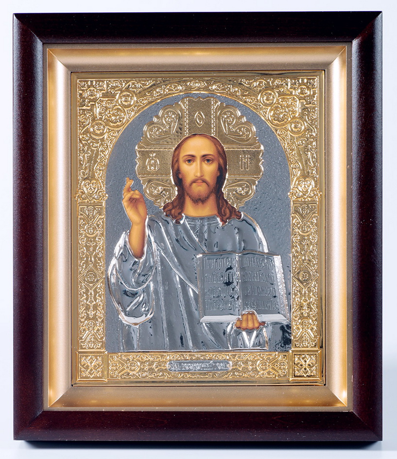 Икона в киоте 15х19 сложный, темпера, риза объёмная, никель, золочение Спаситель 1