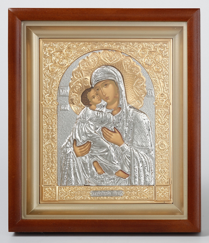 Икона в киоте 15х19 сложный, темпера, риза объёмная, никель, золочение Владимирская БМ