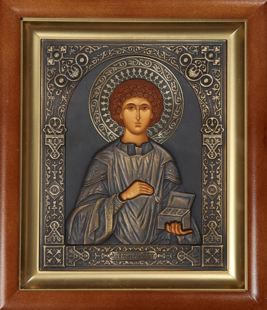 Икона в киоте 15х19 сложный, темпера, риза патинированая Пантелеимон