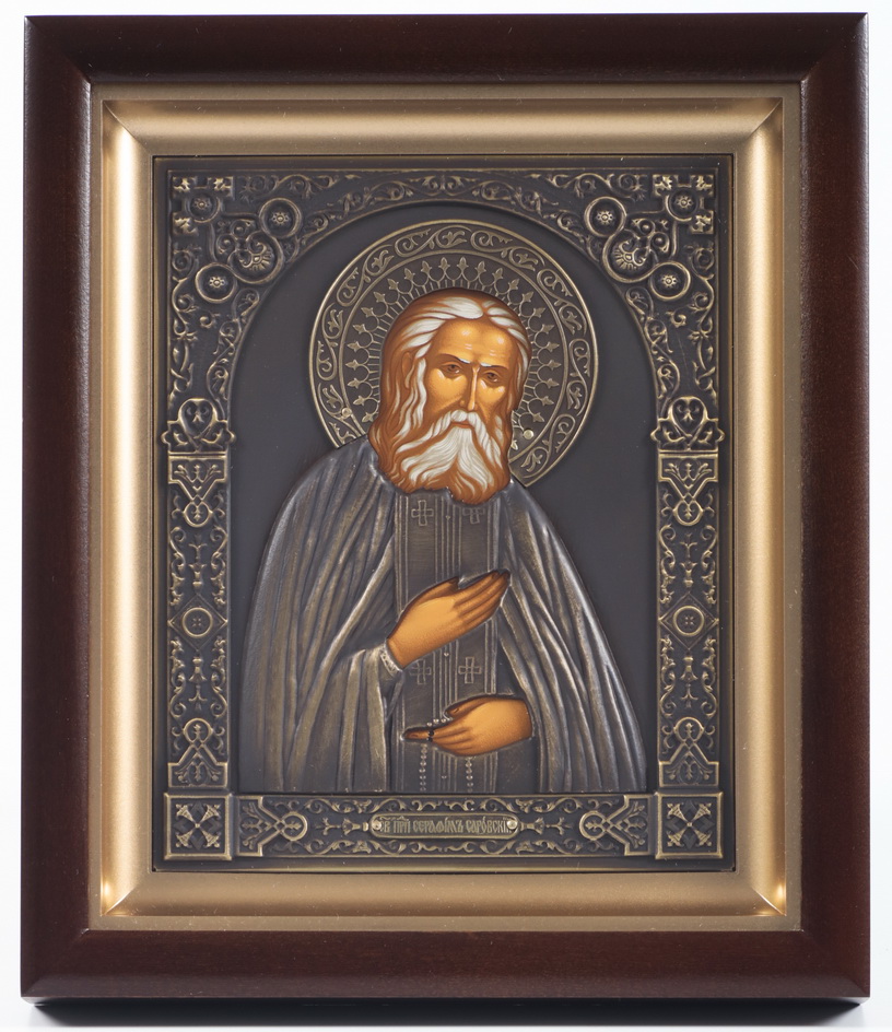 Икона в киоте 15х19 сложный, темпера, риза патинированая Серафим Саровский