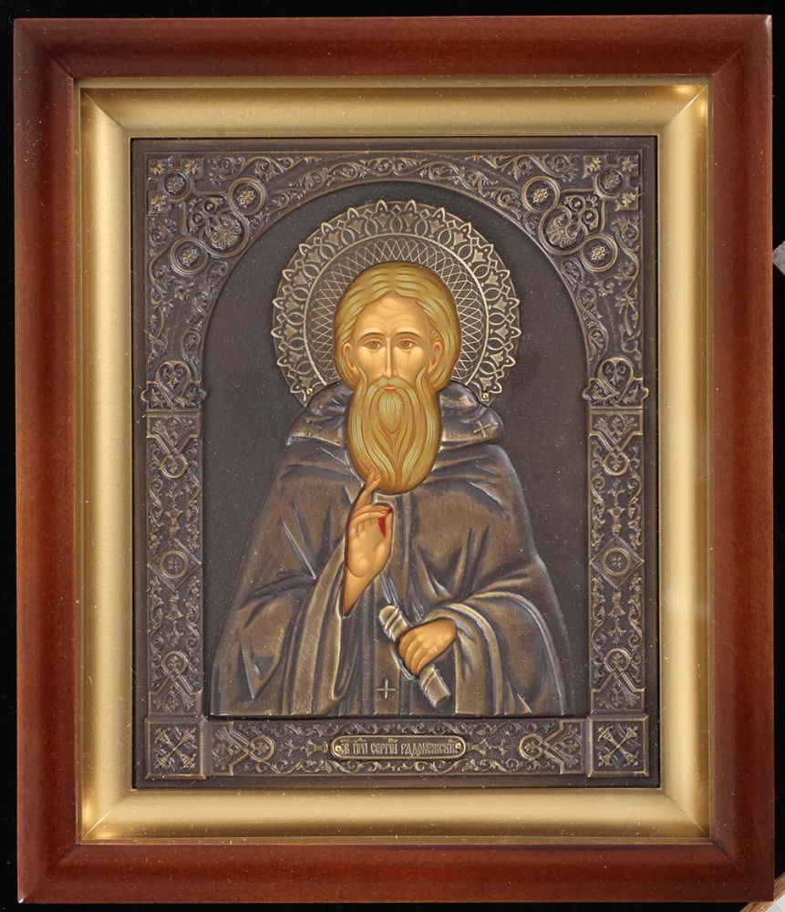 Икона в киоте 15х19 сложный, темпера, риза патинированая Сергий Радонежский