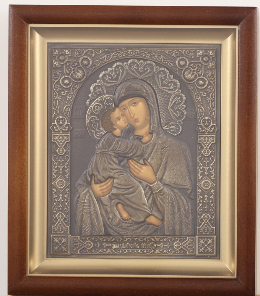 Икона в киоте 15х19 сложный, темпера, риза патинированая Владимирская БМ