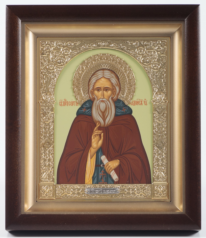 Икона в киоте 15х19 сложный, темпера, венчик, рамка фигурная, золочёная Сергий Радонежский