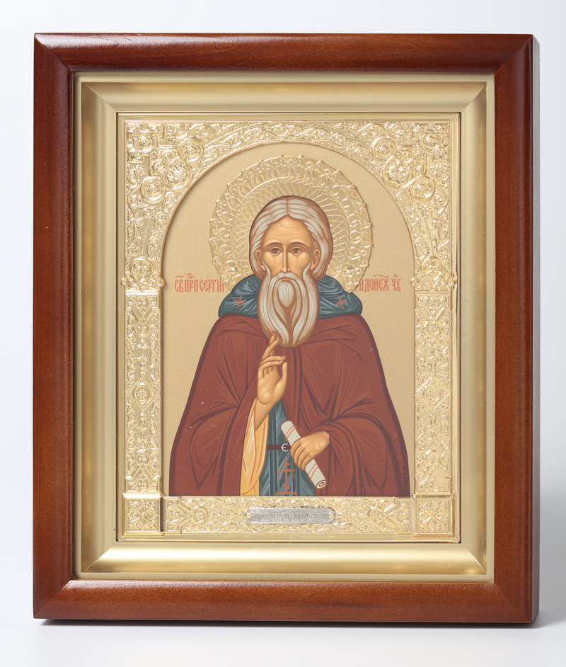 Икона в киоте 15х19 сложный, темпера, венчик, рамка фигурная, золочёная Сергий Радонежский (золотой фон)