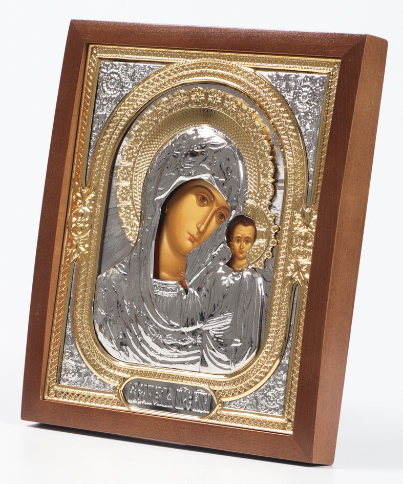 Икона в киоте 18х24 фигурный №2 темпера, без подрамника, риза, никель, золочен Казанская БМ