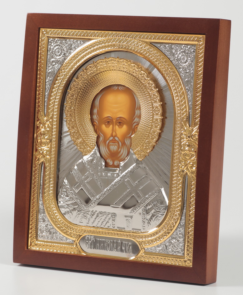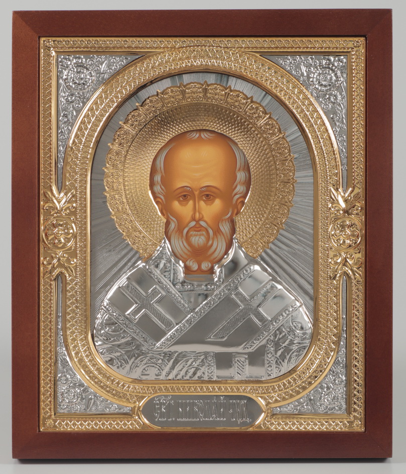 Икона в киоте 18х24 фигурный №2 темпера, без подрамника, риза, никель, золочен Николай Чудотворец