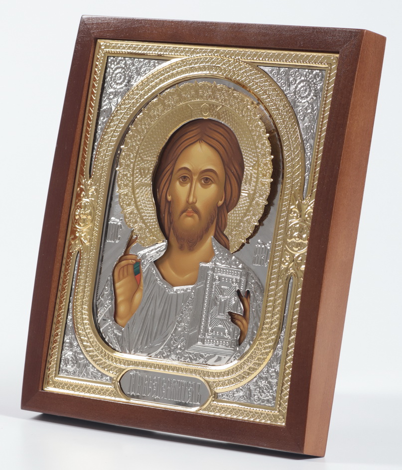 Икона в киоте 18х24 фигурный №2 темпера, без подрамника, риза, никель, золочен Спаситель