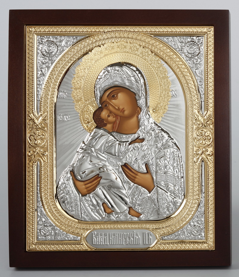 Икона в киоте 18х24 фигурный №2 темпера, без подрамника, риза, никель, золочен Владимирская БМ