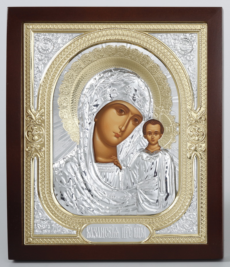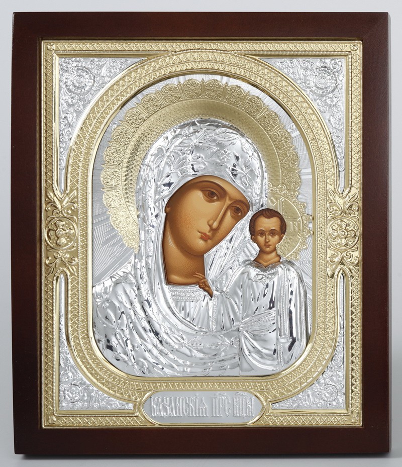 Икона в киоте 18х24 фигурный №2 темпера, без подрамника, риза объёмная №1 Казанская БМ