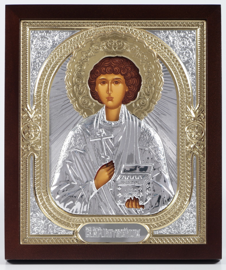 Икона в киоте 18х24 фигурный №2 темпера, без подрамника, риза объёмная №1 Пантелеимон