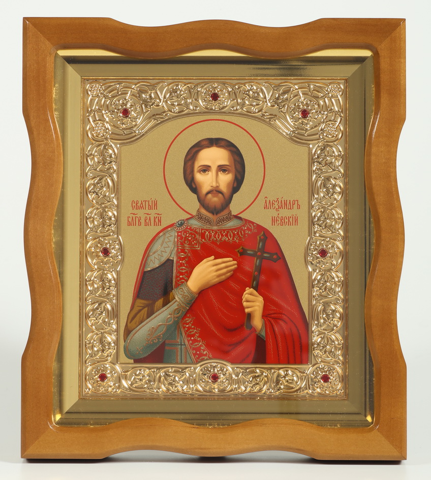 Икона в киоте 18х24 фигурный №4 темпера, рамка фигурная, золочёная, багетный подрамник Александр Невский 1