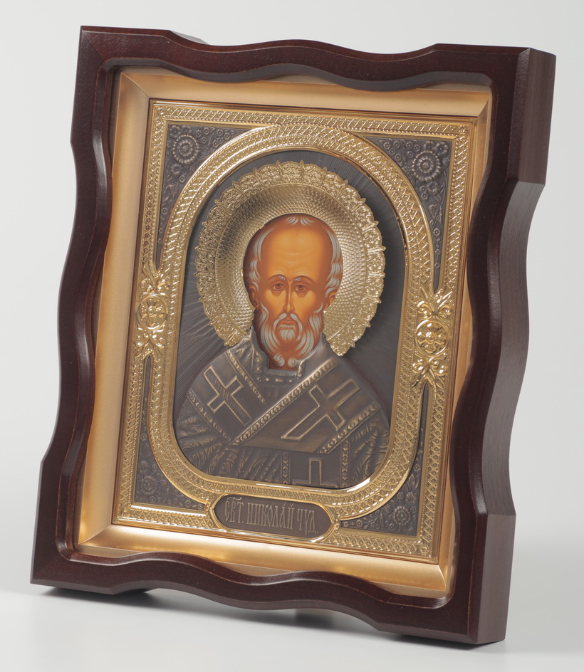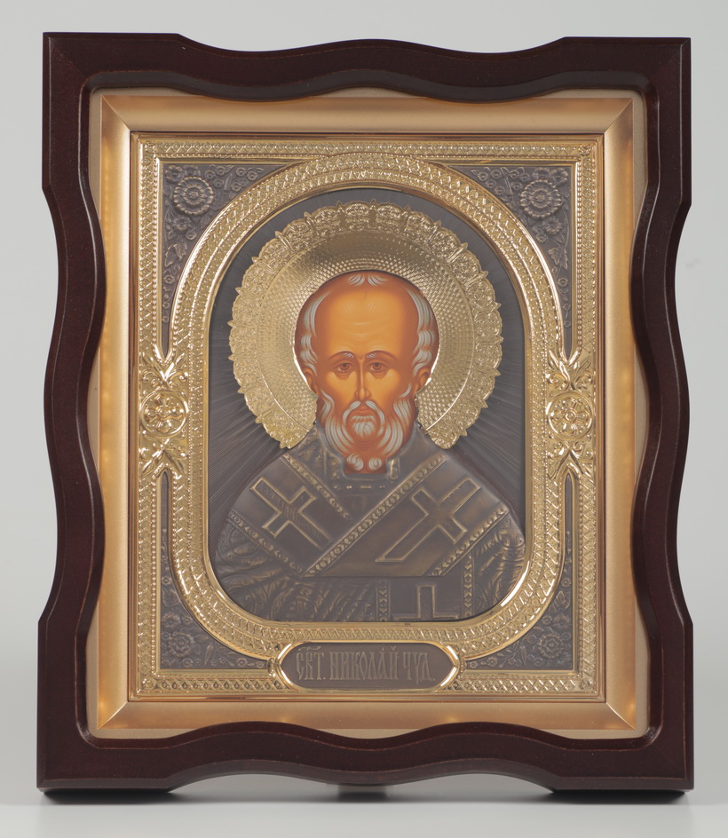 Икона в киоте 18х24 фигурный №4 темпера, риза комбинированная (зол+патин) Николай Чудотворец