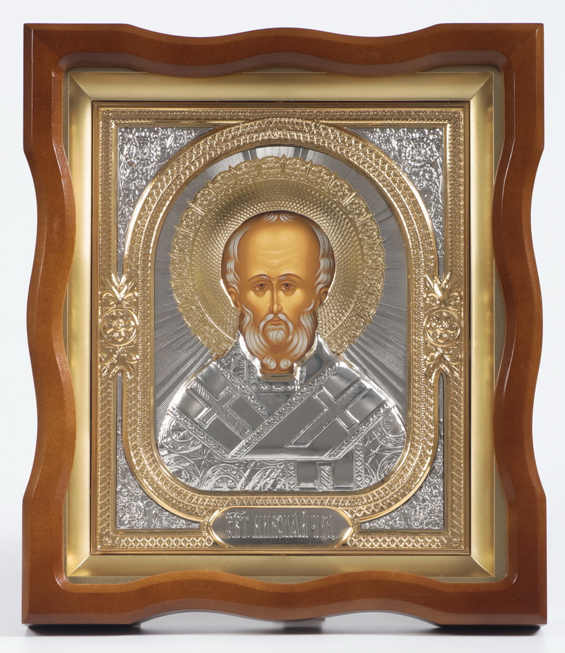 Икона в киоте 18х24 фигурный №4 темпера, риза объёмная, никель, золочение Николай Чудотворец