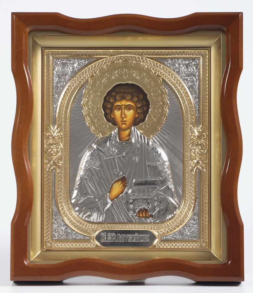 Икона в киоте 18х24 фигурный №4 темпера, риза объёмная, никель, золочение Пантелеимон