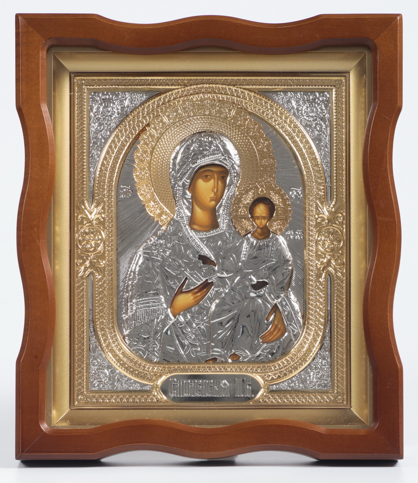 Икона в киоте 18х24 фигурный №4 темпера, риза объёмная, никель, золочение Смоленская БМ