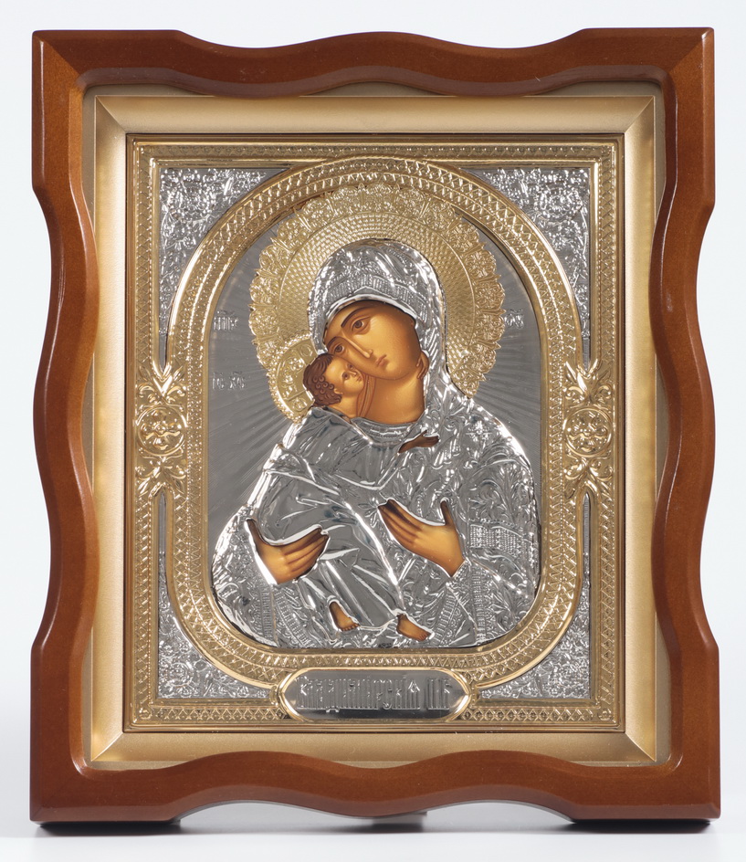 Икона в киоте 18х24 фигурный №4 темпера, риза объёмная, никель, золочение Владимирская БМ