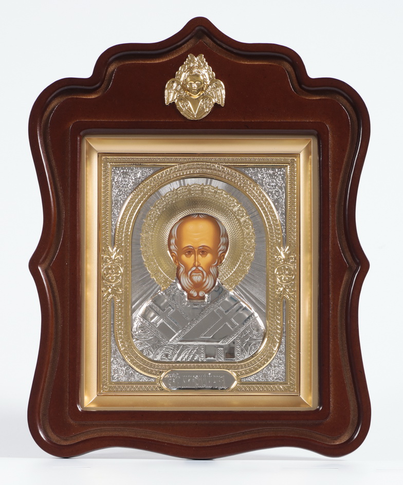 Икона в киоте 18х24 фигурный с навершием, темпера, риза объемная, частично золочёная Николай Чудотворец