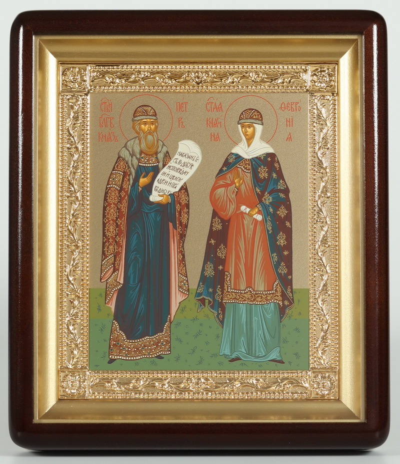 Икона в киоте 18х24 фигурный, темпера №8, рамка золочёная Петр и Феврония