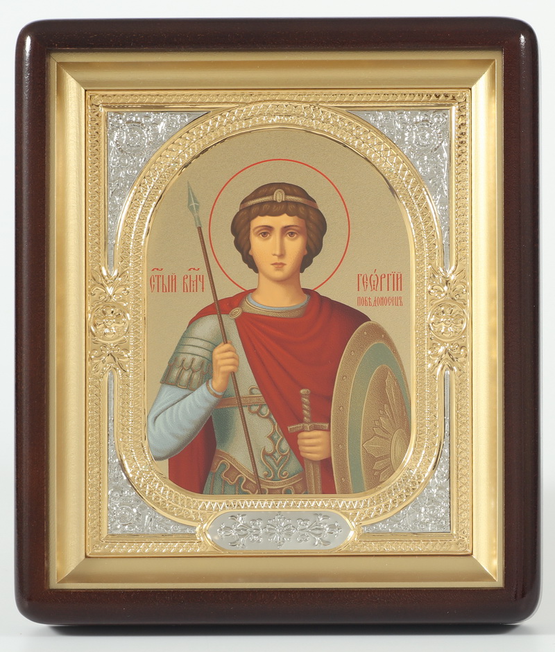 Икона в киоте 18х24 фигурный, темпера №8, риза-рамка объемная, открытая, золочёная, никелирование Георгий Победоносец 1