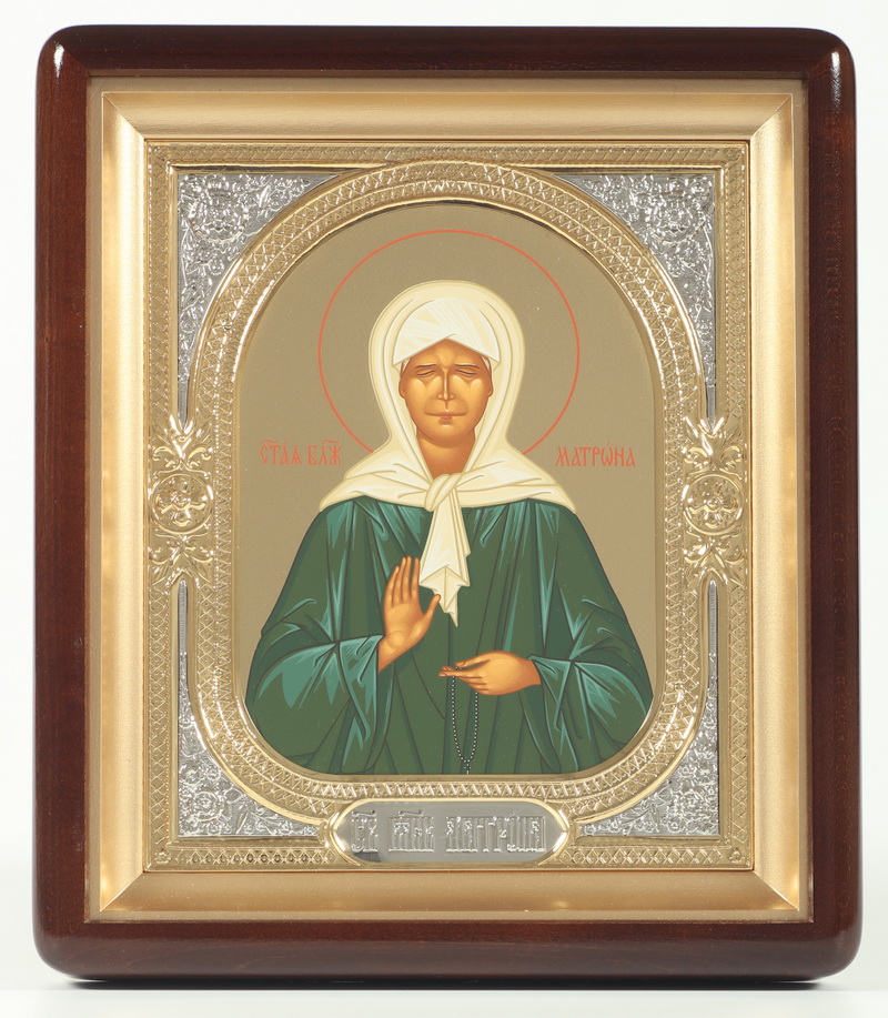 Икона в киоте 18х24 фигурный, темпера №8, риза-рамка объемная, открытая, золочёная, никелирование Матрона
