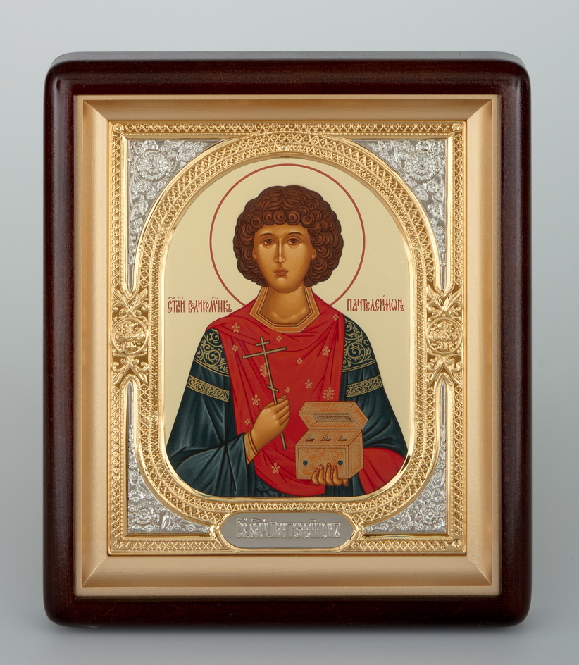 Икона в киоте 18х24 фигурный, темпера №8, риза-рамка объемная, открытая, золочёная, никелирование Пантелеимон