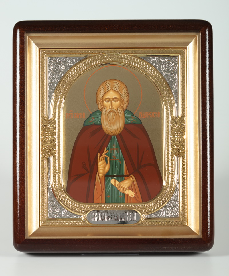 Икона в киоте 18х24 фигурный, темпера №8, риза-рамка объемная, открытая, золочёная, никелирование Сергий Радонежский