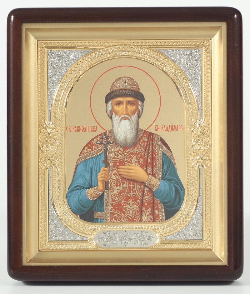 Икона в киоте 18х24 фигурный, темпера №8, риза-рамка объемная, открытая, золочёная, никелирование Владимир равн. князь Киевск. 1