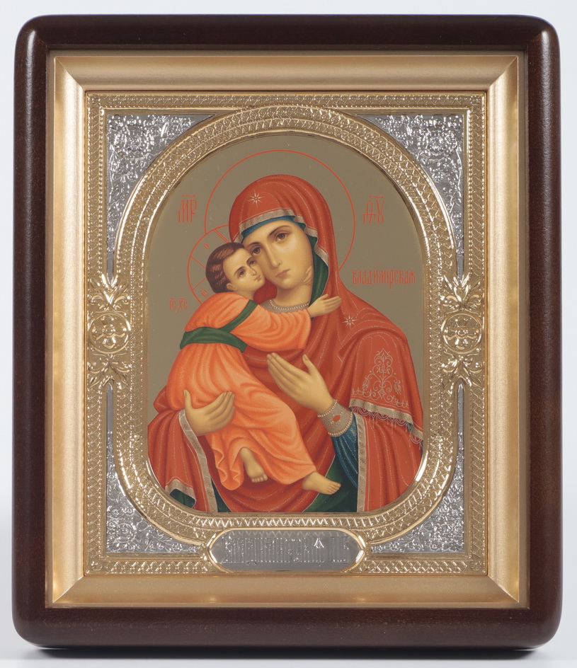 Икона в киоте 18х24 фигурный, темпера №8, риза-рамка объемная, открытая, золочёная, никелирование Владимирская БМ 1