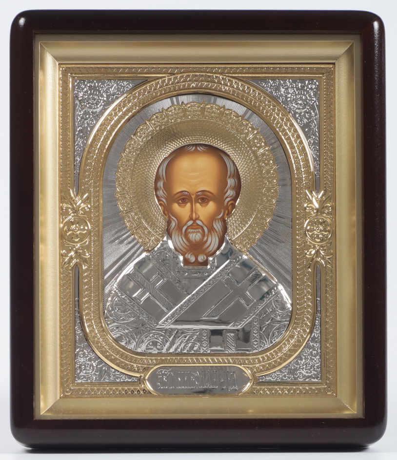 Икона в киоте 18х24 фигурный, темпера, риза объёмная, никель, золочение Николай Чудотворец
