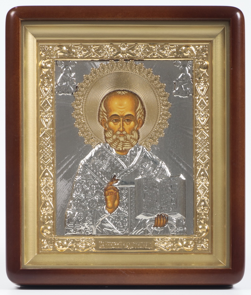 Икона в киоте 18х24 фигурный, темпера, риза объёмная, закрытая, частично золочёная Николай Чудотворец