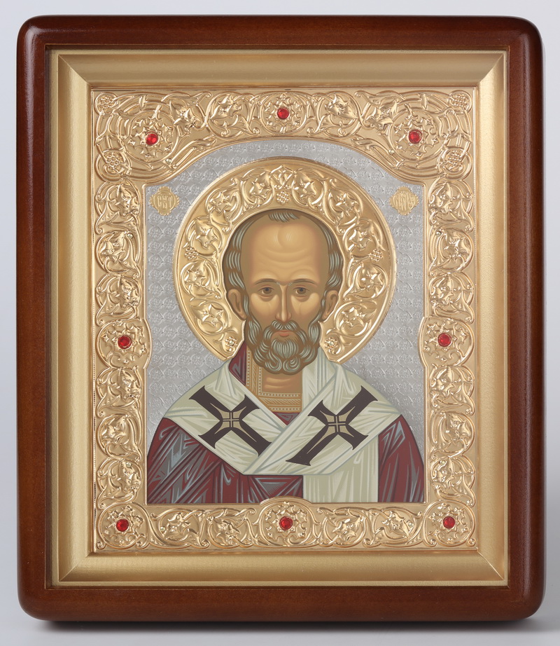 Икона в киоте 18х24 фигурный, темпера, риза объемная, зол., никелир., без цаты Николай Чудотворец
