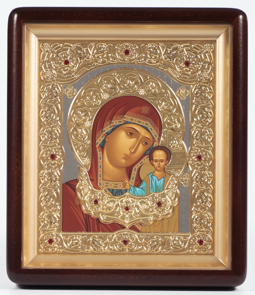 Киот-липа, аэрозольный подрамник, риза-латунь(никель, золочение) камни, стекло, изображение-шелкография.