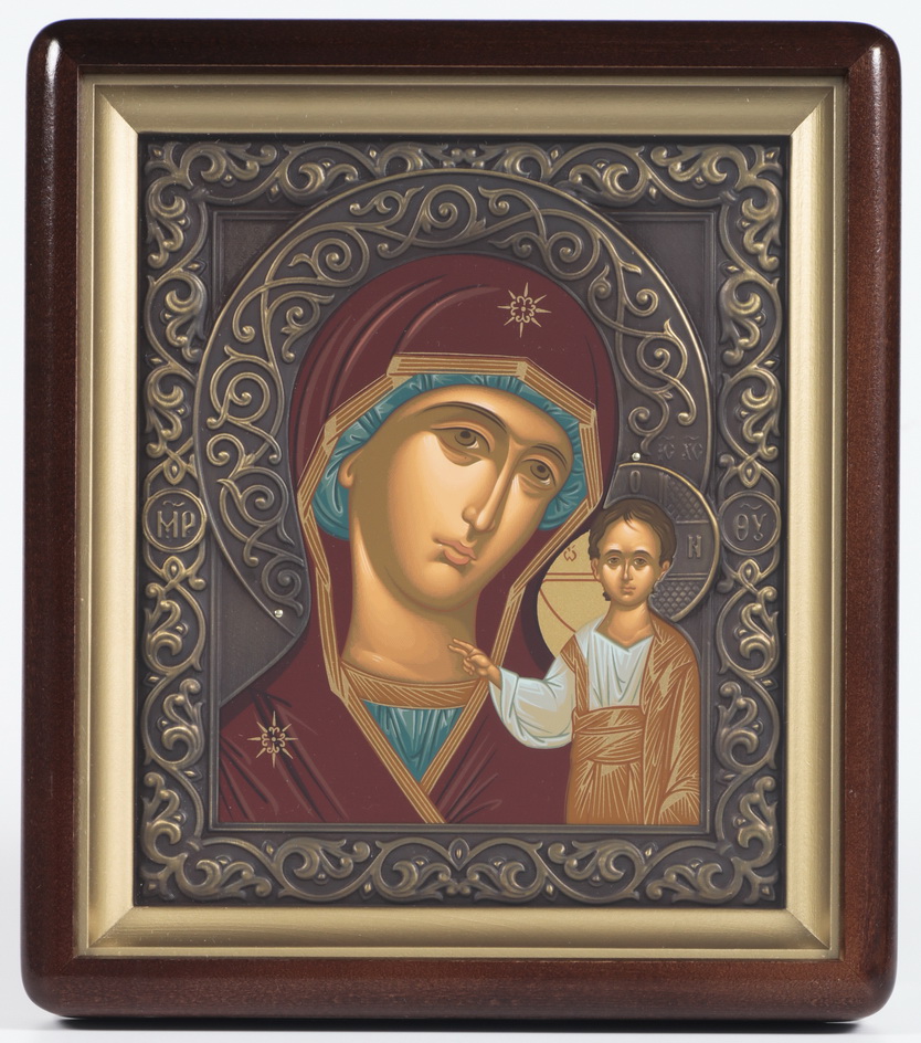 Икона в киоте 18х24 фигурный, темпера, риза патинированая Казанская БМ