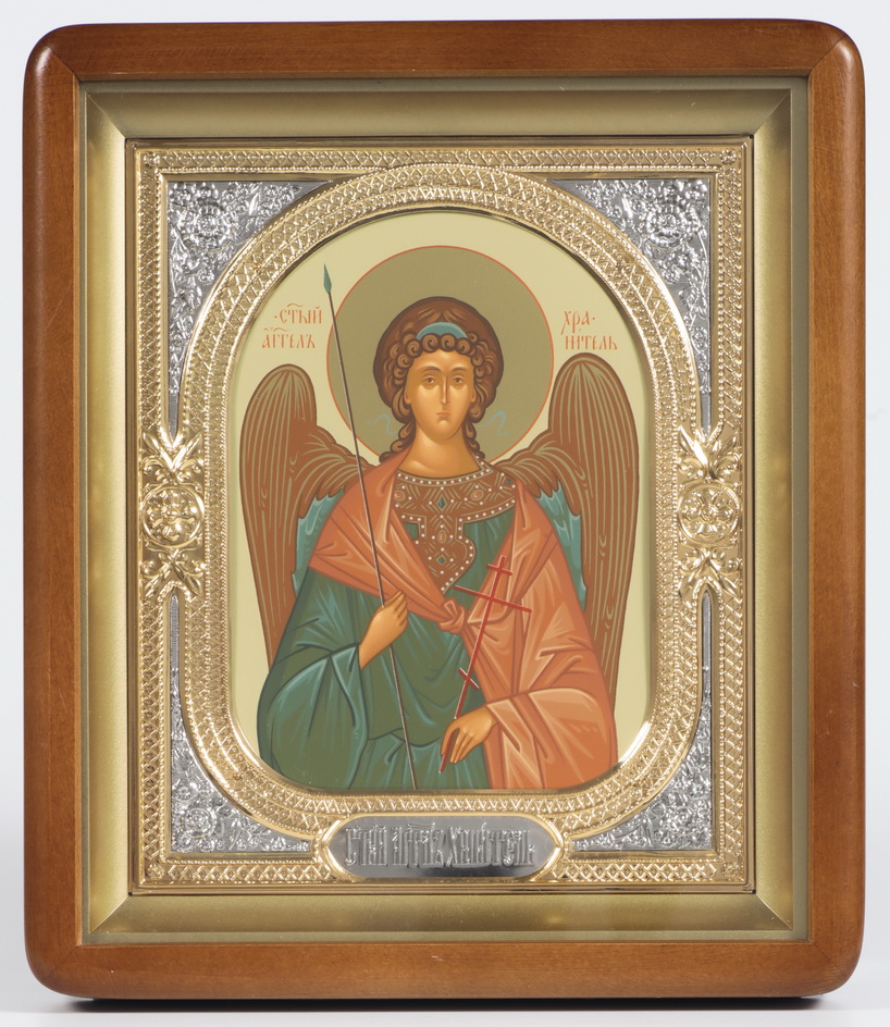 Икона в киоте 18х24 фигурный, темпера, риза-рамка объемная, открытая, золочёная, никелирование Ангел-Хранитель